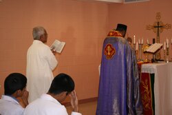 While the creed is being said, the priest turns to the clergy and people and asks for forgiveness and requests them to pray to the Lord to accept his oblations. The priest then kneels before the altar and beseeches the Lord for remission of sins and acceptance of his offering. The priest prays for and makes the sign of the cross with his right thumb on the altar mentioning the names of those alive and departed for whom prayers have been requested.